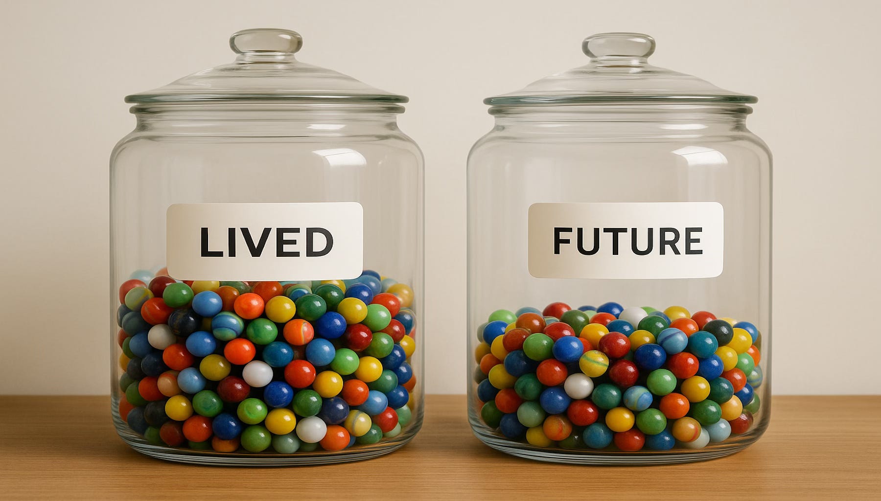 Karen keeps two jars in her kitchen. One holds marbles representing the number of months she has left (if she lives to 100). The other is for months she’s already lived.